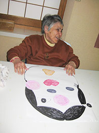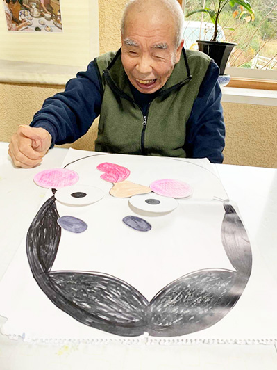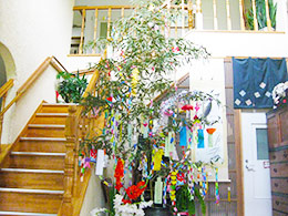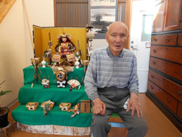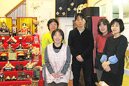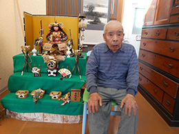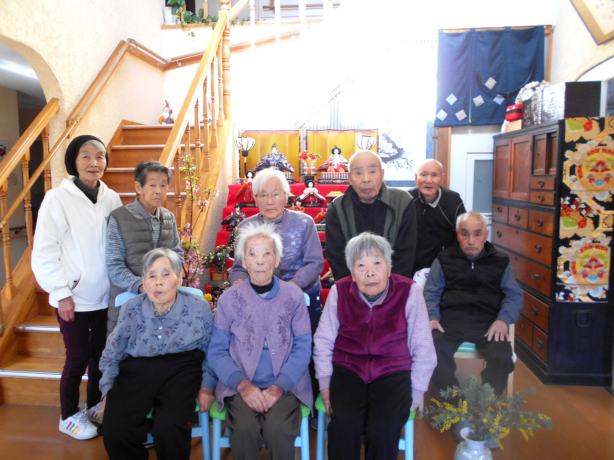玄関ホールに飾るひな人形とグループホームの利用者様。