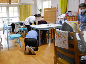 地震発生を想定して机や本で頭を守る訓練を行いました。